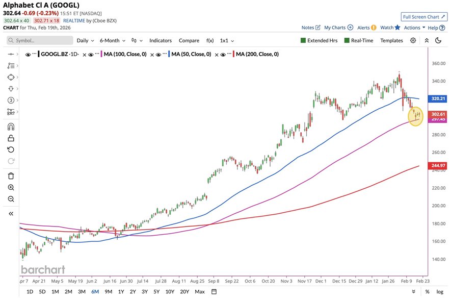 Alphabet cayó por debajo de su media móvil de 50 días la semana pasada y ahora se sitúa justo en la de 100 días