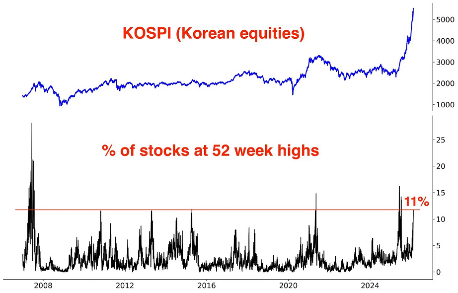 El Kospi surcoreano se ha disparado en los últimos meses, pero el número de acciones que alcanzan nuevos máximos no ha subido en la misma proporción