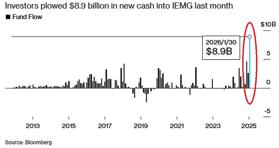 Ismael Abdelkhalek. Redacción de Estrategias de InversiónEl ETF de mercados emergentes, IEMG, registró entradas por valor de 8.900 millones de dólares en enero, la mayor cifra mensual desde su creación en 2012.