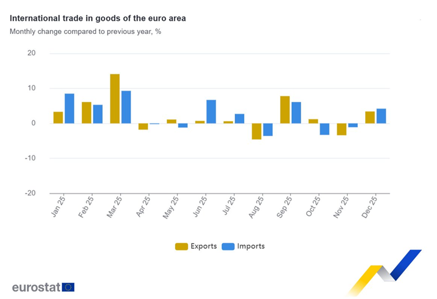 La balanza comercial de la Eurozona registró un superávit de 12.600 millones de euros en diciembre, mientras que la UE registró un superávit de 12.900 millones de euros