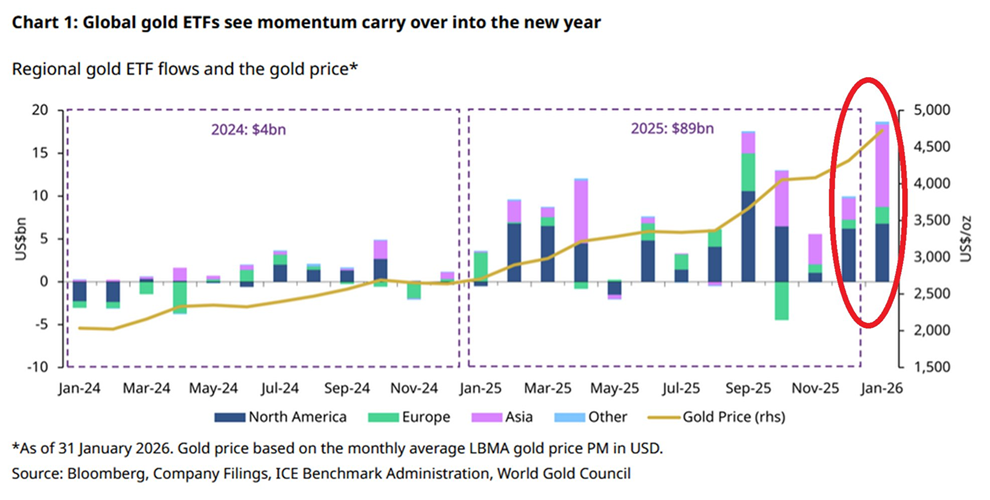 Los ETF de oro globales atrajeron más de 19.000 millones de dólares en entradas netas en enero, el mejor mes de la historia