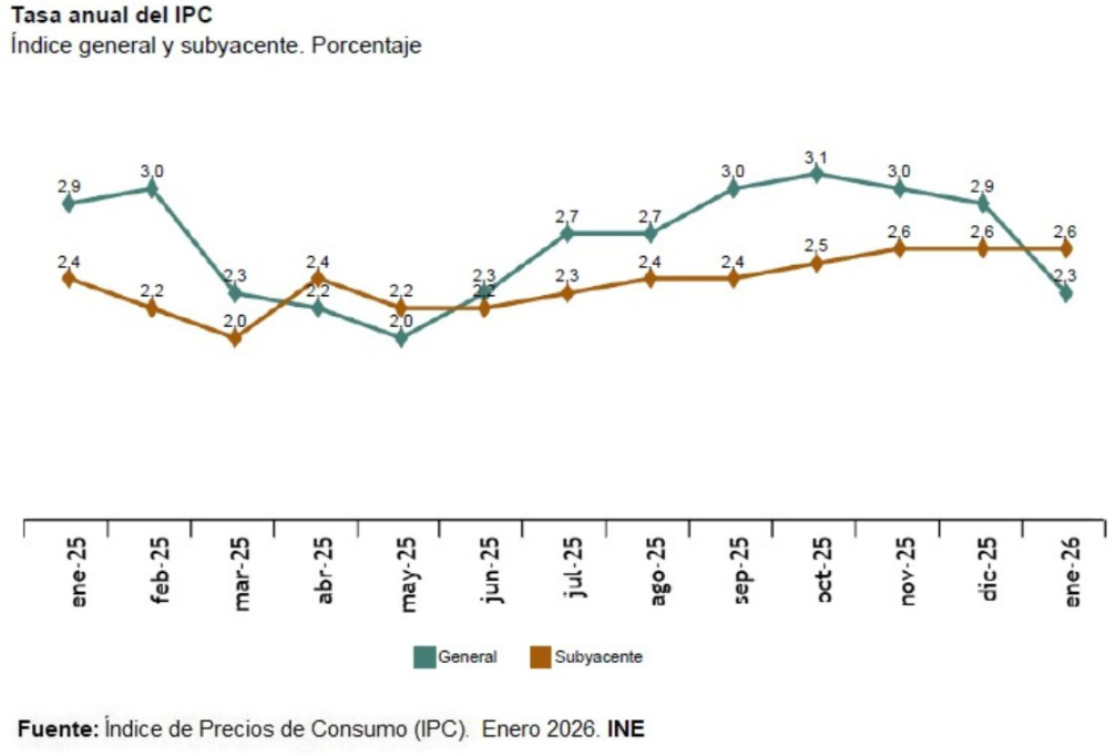 Ismael Abdelkhalek. Redacción de Estrategias de InversiónLa tasa de variación anual del IPC del mes de enero se situó en el 2,3%, seis décimas por debajo de la registrada en diciembre, según el INE, que añade que la inflación subyacente se mantuvo en el 2,6%.