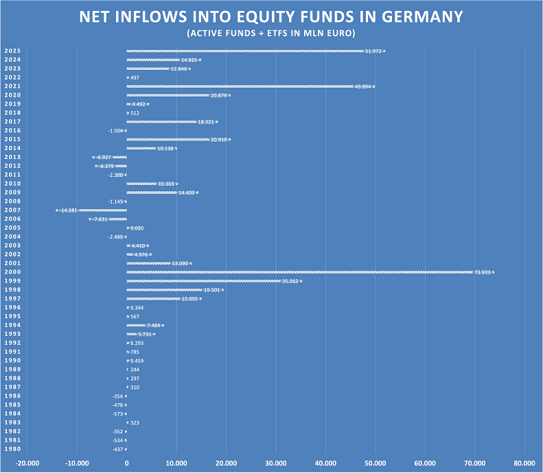 Ismael Abdelkhalek. Redacción de Estrategias de InversiónLas entradas netas en fondos de renta variable y ETF de renta variable ascendieron a casi 52.000 millones de euros el año pasado, según el analista Holger Zschaepitz, lo que lo convierte en el segundo mejor año de la historia después del auge de 2000, cuando los inversores alemanes invirtieron 74.000 millones de euros en fondos de renta variable.