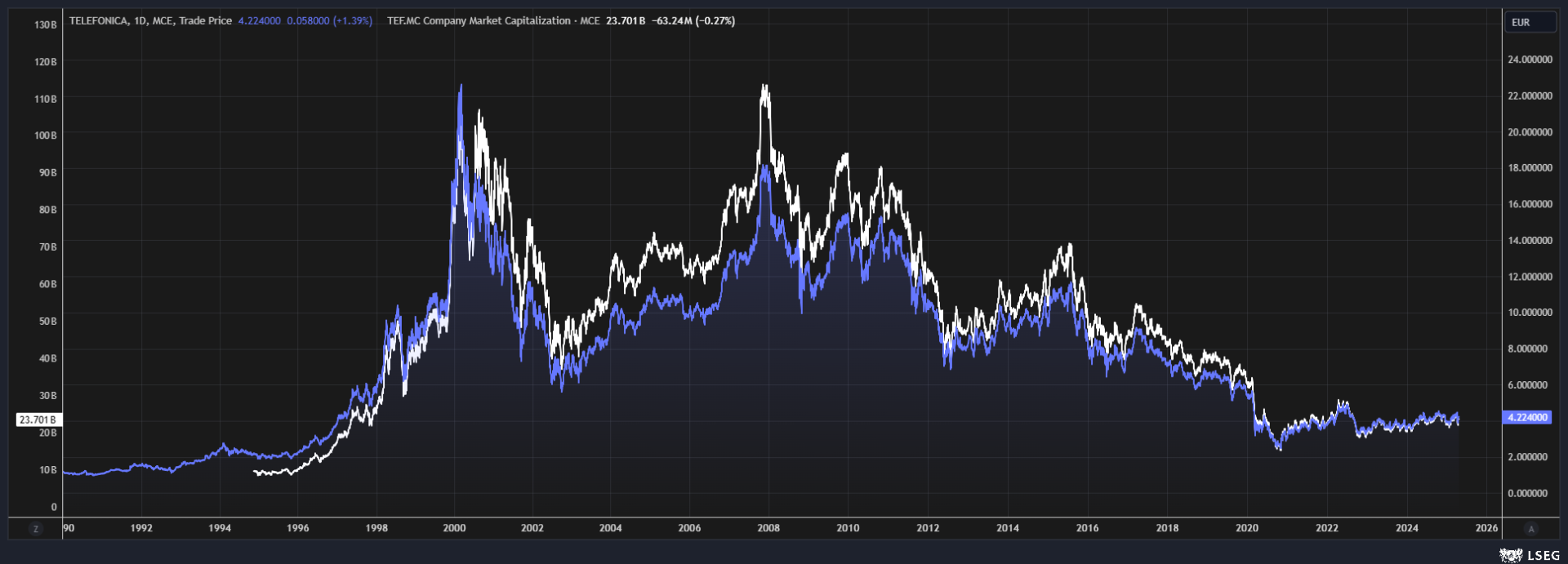 Actualmente la cotización se sitúa en los 4,25 euros, niveles que le dan un valor en Bolsa de unos 24.000 millones de euros. Desde hace un año la teleco vive una nueva etapa en la que de nuevo el Estado es su principal accionista: la Sociedad Estatal de Participación Industriales (SEPI) controla un 10% del capital, superando el 9,99% de Criteria Caixa y el 9,97% de Saudi Telecom Company (STC), la teleco saudí cuya entrada supuso la respuesta del Gobierno.
