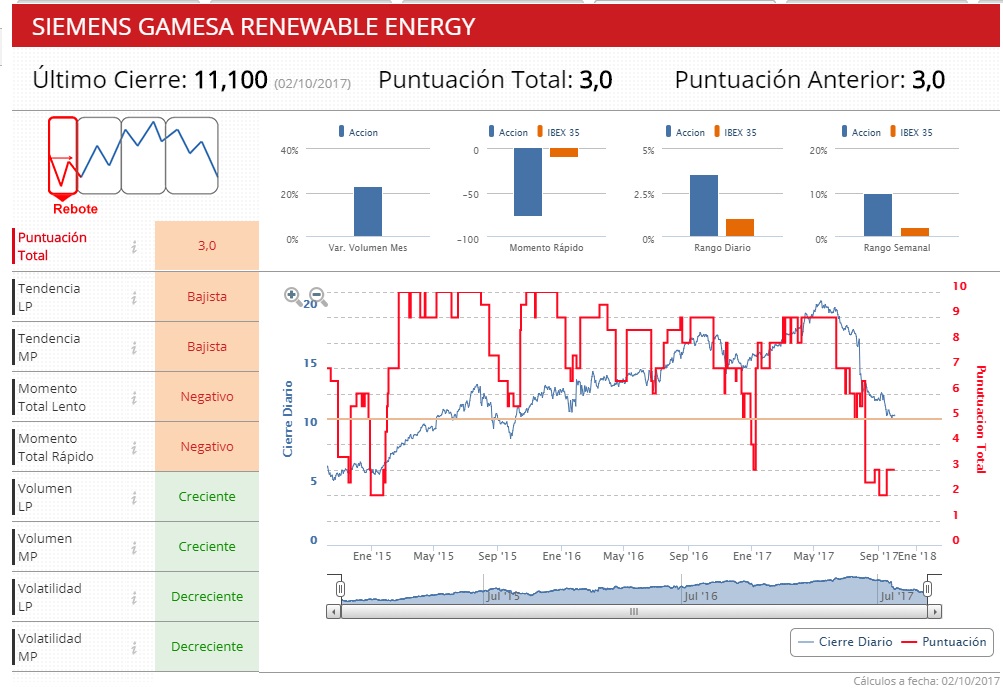 Los indicadores técnicos de Estrategias de Inversión dan una puntuación a Siemens Gamesa de 5,5 sobre 10, al considerar que el fabricante de aerogeneradores se encuentra en fase de consolidación, con una tendencia bajista en el medio plazo y alcista en el largo.