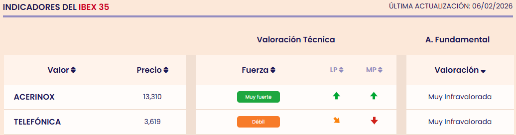 Por análisis fundamental, dos empresas lideran el ranking de valores con mejores ratios fundamentales del Ibex 35, al estar muy infravaloradas, es decir, que cotizan a un precio muy inferior a su precio justo. Se trata de Acerinox y Telefónica.