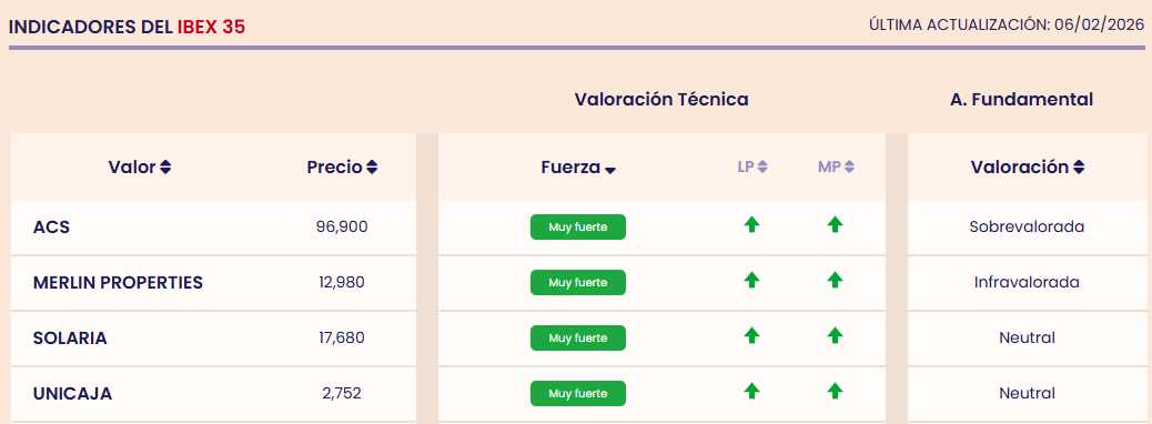 En concreto, 23 valores del selectivo español están muy fuertes, al igual que el índice. ACS, MERLIN Properties, Solaria o Unicaja son algunos de los mejores valores del Ibex 35 por análisis técnico, al tener una tendencia alcista tanto en el largo como el medio plazo. (Conoce el resto de valores muy fuertes del Ibex 35).