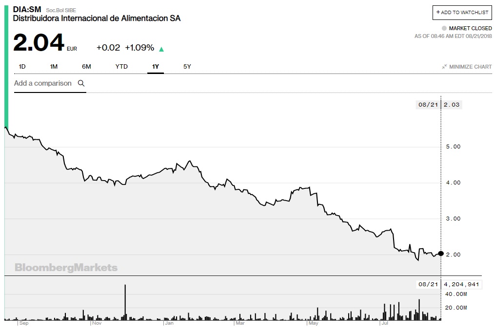 El mercado castiga con saña a DIA tras la presentación de sus resultados semestrales en el que sus beneficios cayeron un 88,8%, hasta los 6 millones de euros frente a los 54 millones del mismo período de 2017. Los ingresos de la cadena de distribución se redujeron un 10,3% hasta los 3.800 millones. Las cuentas de DIA mostraron una reducción de los márgenes, la depreciación del peso argentino más de un 31% y de un 17% en el caso del real brasileño frente al euro.