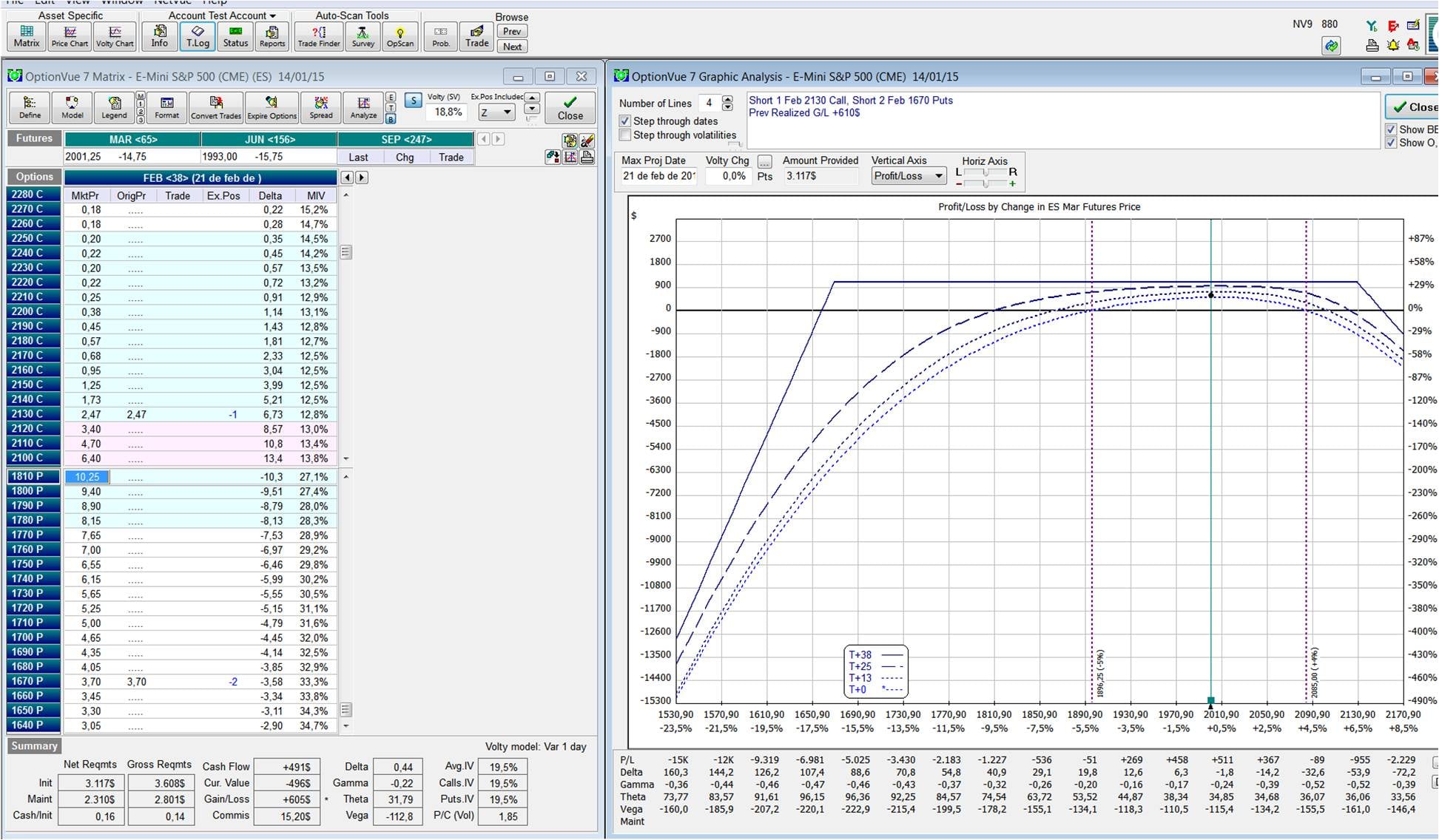 1. (5) La recompra de las 2 antiguas opciones de Enero que apenas tienen valor. Se recompran por 15/22 centavos cada una. Y a la vez vendemos las nuevas opciones de febrero, en concreto la call 2130 (130 puntos por encima del actual nivel del mercado) por 2,47 y las 2 puts 1670 (230 puntos por debajo del nivel actual del mercado) por 3,70 cada una. (Acuérdate que estos precios se multiplican por 50 para ver el valor real monetario). De nuevo todo muy conservador.