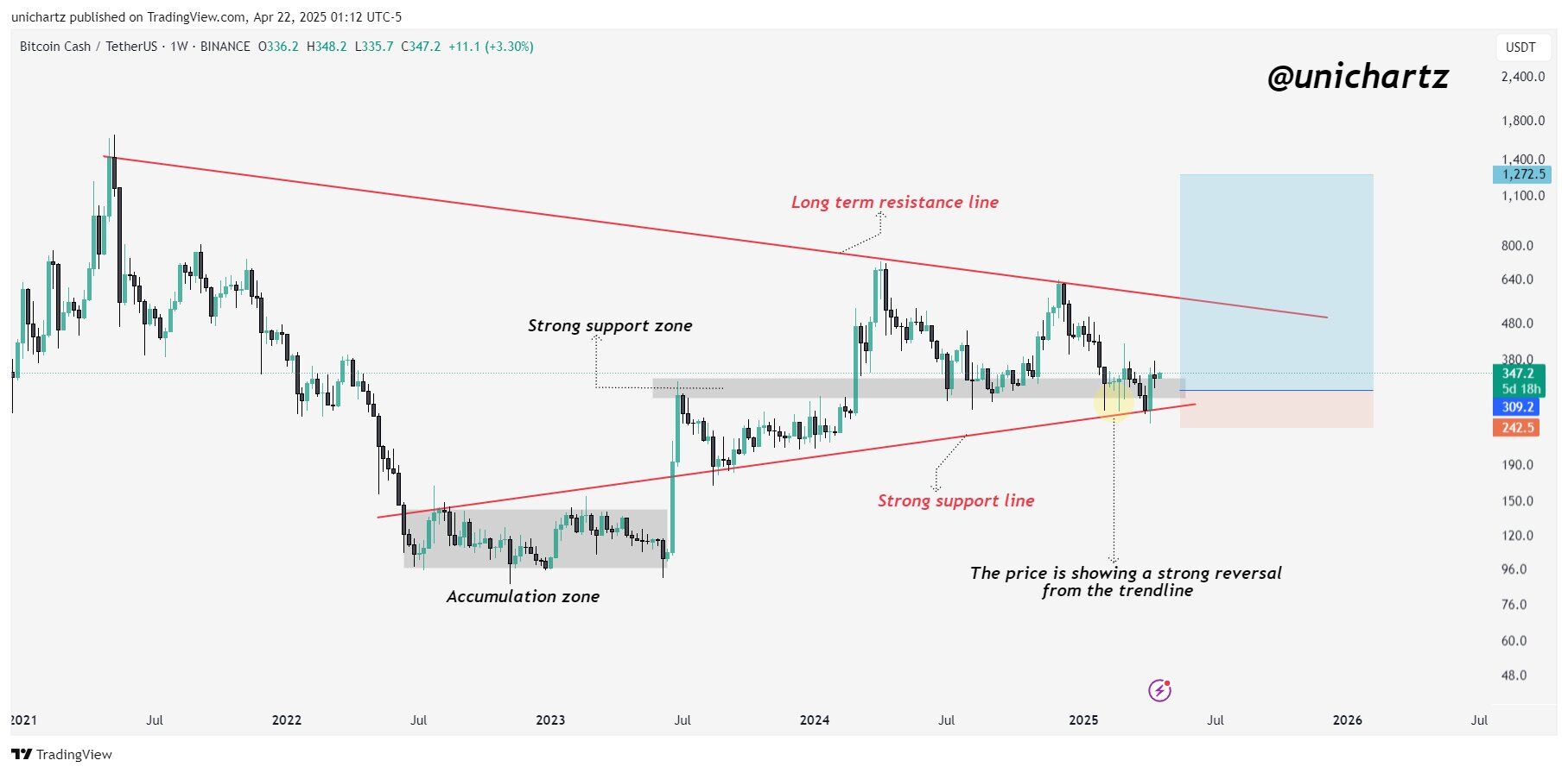 Según una actualización reciente de UniChartz en X, Bitcoin Cash ha experimentado un cambio de tendencia notable desde su línea de tendencia de soporte ascendente a largo plazo, manteniéndose firmemente por encima del nivel crucial de 309 dólares. Esta zona ha actuado históricamente como una base sólida para movimientos alcistas, y el último rebote confirma aún más su importancia.
