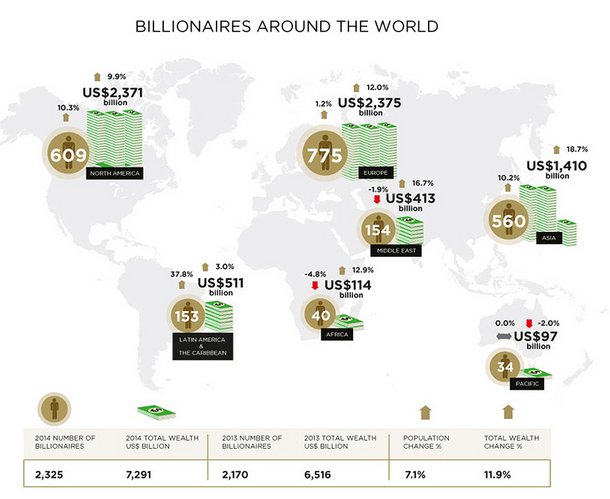 El año ha terminado con 155 billonarios más que 2013. En estos momentos hay 2.325 personas en todo el mundo con un patrimonio de más de 7.000 millones de dólares, es decir, las mismas que residen hoy en el municipio madrileño de Chapinería. Por cierto, que 21 de estos súper ricos viven en Madrid.