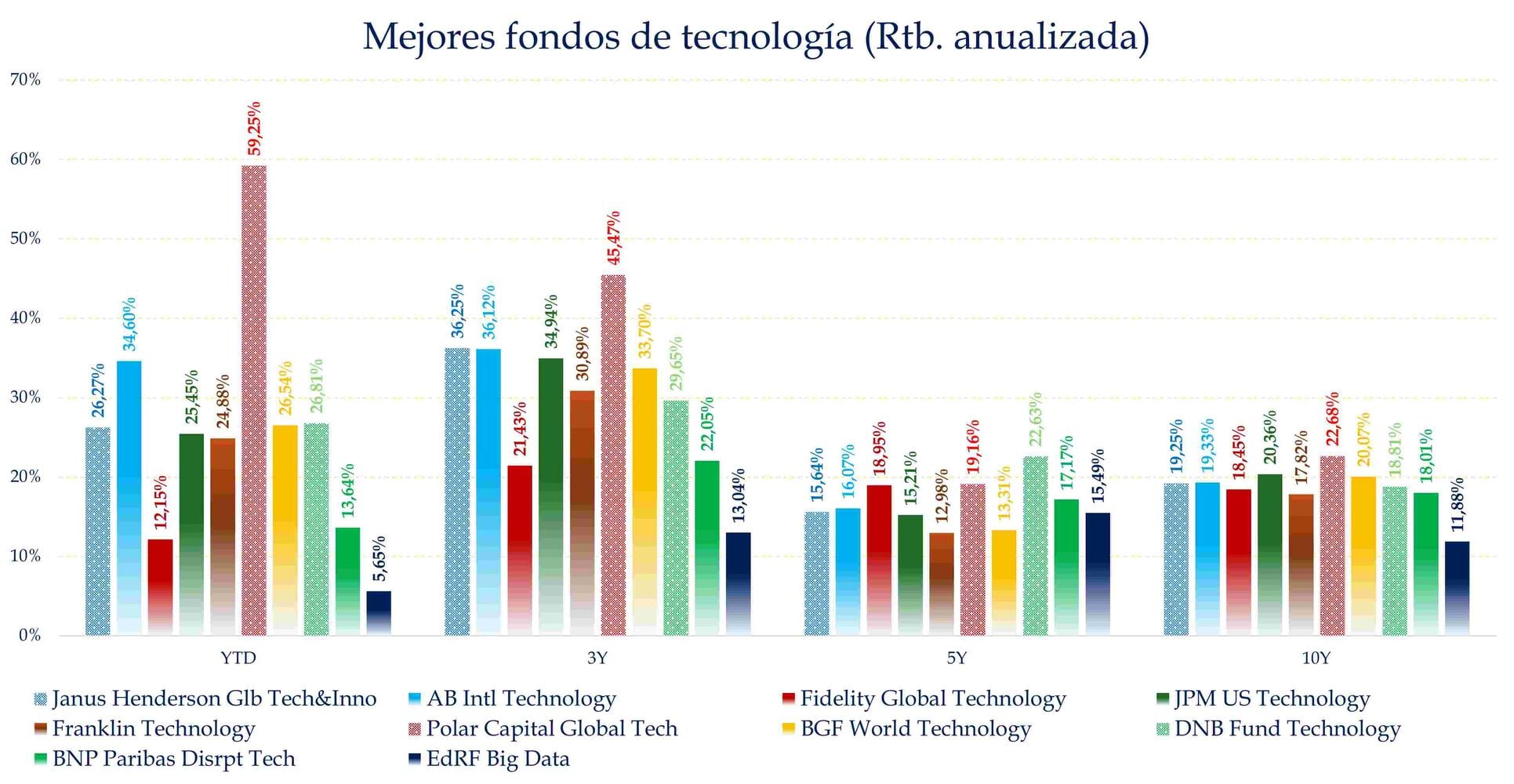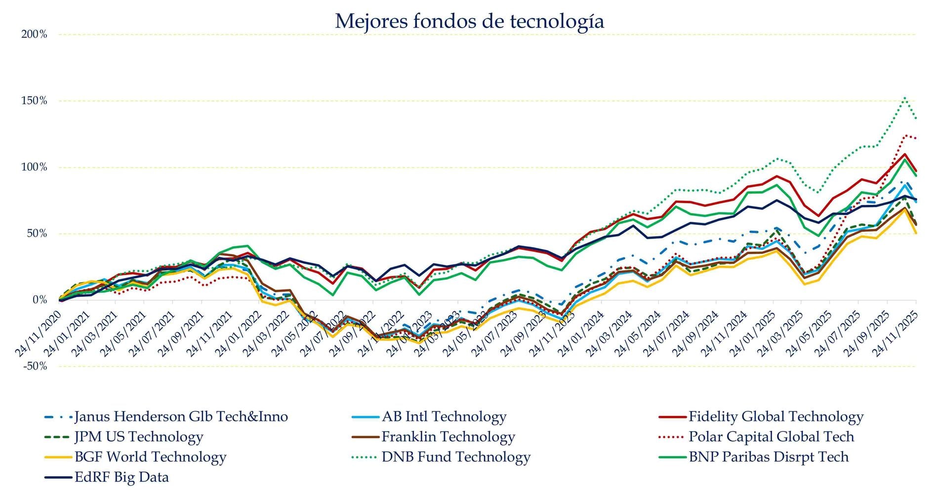 Si buscas mucha exposición a Estados Unidos, puedes elegir entre: Janus Henderson; AB Intl Technology; Polar Capital; Franklin; BGF World Tech; y, por supuesto, el JPM US Tech (más del 90%). Con más Asia y Europa, te encuentras: DNB Technology (Nokia, Ericsson, Samsung); Fidelity Technology (Ericsson, Accenture); BNP Disruptive Tech (ASML); y, por descontado, Edr Big Data (Arcadis, OVH).