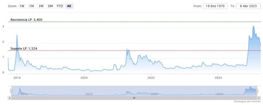 El soporte a mediano plazo se encuentra en los 1.61 dólares. Mientras, los indicadores de Ei se muestran prácticamente bajistas.