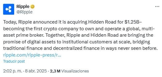 Con la intención de impulsar su moneda estable RLUSD, Ripple ha adquirido la plataforma de corretaje preferencial Hidden Road por 1.25 mil millones de dólares en efectivo, acciones y tokens. La transacción ha cuadruplicado la capitalización de mercado de su stablecoin, según Protos.