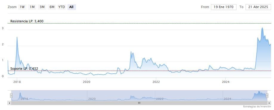 La resistencia a mediano plazo se encuentra en los 3 dólares. Mientras, los indicadores de Ei se muestran mixtos.