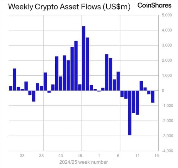El cambio de tendencia también se reflejó en los productos de inversión en criptomonedas con sede en Suiza, que lideraron las entradas netas, sumando 43.7 millones de dólares, seguidos de Alemania y Canadá, con 22.3 y 9.4 millones de dólares, respectivamente. Mientras tanto, los fondos con sede en EE. UU., que suelen ser el mercado dominante en la dirección general de los flujos globales, se desplomaron, registrando salidas netas semanales de 71 millones de dólares, a medida que la crisis arancelaria de Trump seguía afectando a los mercados globales.