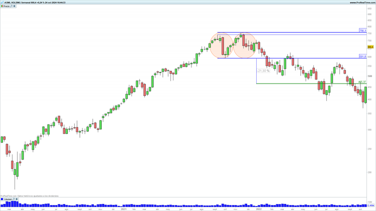 ASML (ASML) en gráfico semanal con la formación de una figura chartista de doble techo y volumen de negociación (ventana inferior)