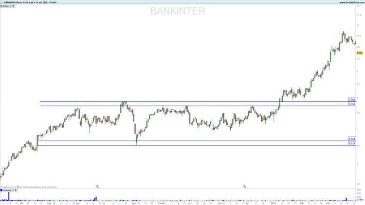 Bankinter (BKT) en escala diaria con actividad de contratación (ventana inferior). Fuente: ProRealTime y elaboración propia.