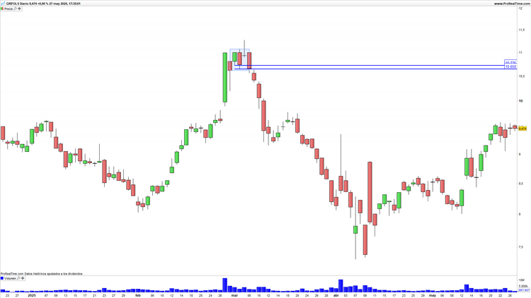 Grifols en gráfico diario con volumen de contratación (ventana inferior)