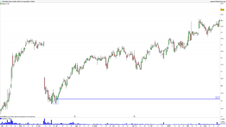 Naturgy en gráfico diario con volumen de contratación (ventana inferior)
