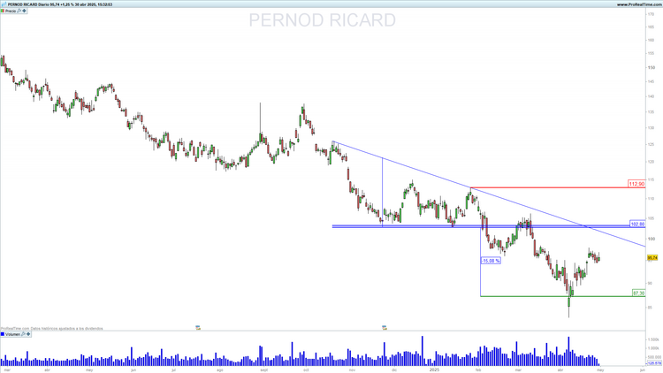 Pernod Ricard (RI) en escala diaria con volumen de negociación (ventana inferior). Fuente: Prorealtime y elaboración propia.