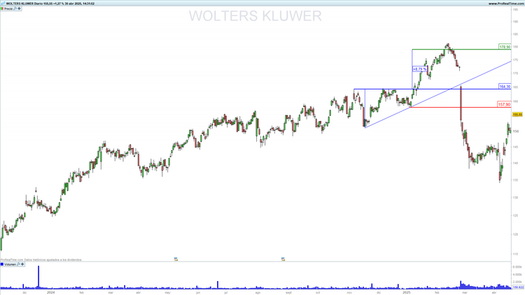 Walters Kluwer (WKL) en escala diaria con volumen de negociación (ventana inferior). Fuente: Prorealtime y elaboración propia.