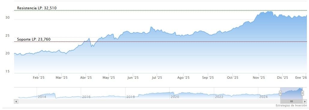 Las acciones de Endesa afrontan este 2026 que acaba de empezar tras haber acumulado una subida de un 55,72% en 2025, si bien han perdido algo de fuelle desde que marcasen máximos en 32,51 euros el 13 de noviembre.