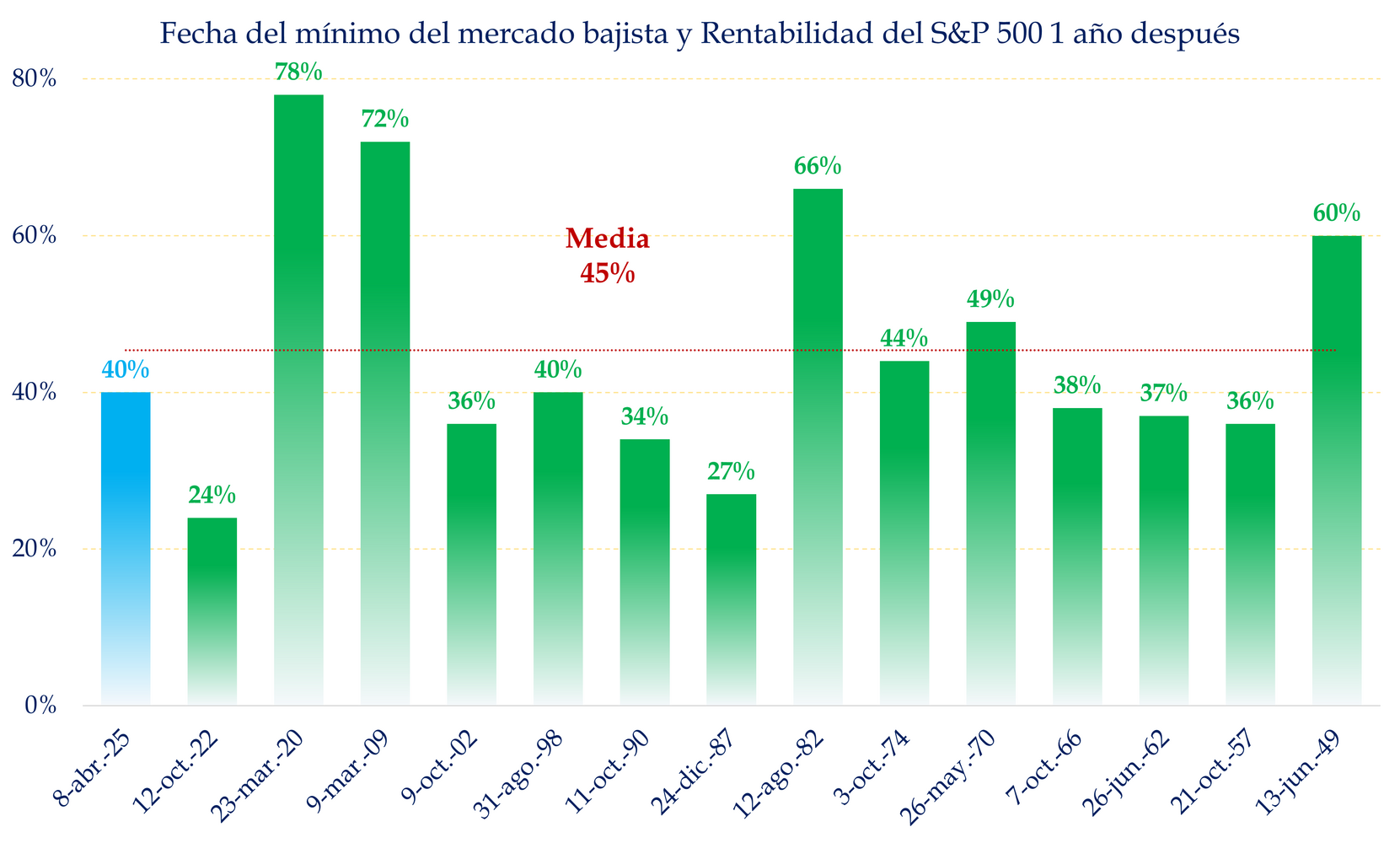 Mira el gráfico que he preparado. La recuperación posterior tiene una media del +45%en tan solo 12 meses y, normalmente, cuanto más grande ha sido la caída, mayor ha sido la subida posterior.