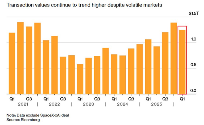 Ismael Abdelkhalek. Redacción de Estrategias de InversiónEl valor de las operaciones de fusiones y adquisiciones a nivel mundial se disparó un 18% interanual en el primer trimestre, hasta alcanzar los 1,25 billones de dólares, la cifra más alta registrada en un primer trimestre.