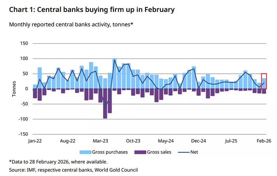 Los bancos centrales globales compraron +19 toneladas de oro en febrero, registrando su 23ª compra mensual consecutiva