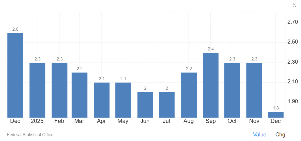 La tasa de inflación en Alemania disminuyó al 1,80 % en diciembre desde el 2,30 % registrado en noviembre