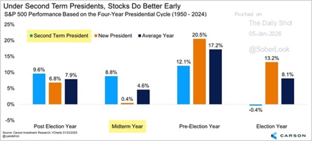 Históricamente, las acciones tienden a ser débiles en los años de mitad de mandato, y 2026 lo es