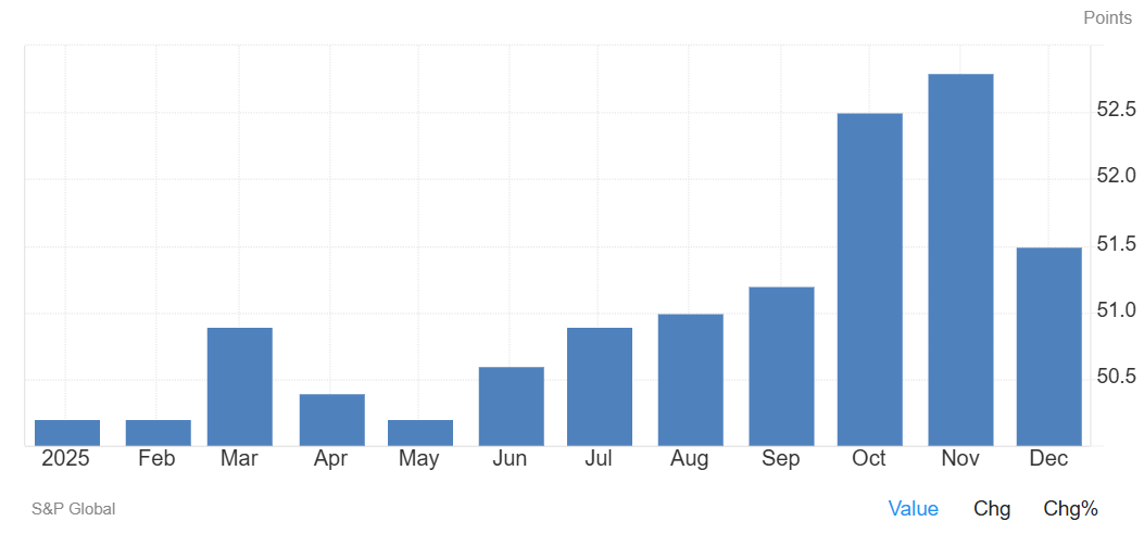 El PMI compuesto de la Eurozona en diciembre se sitúa en 51,5, desde una estimación preliminar de 51,9 y por debajo del máximo de 30 meses registrado en noviembre, de 52,8