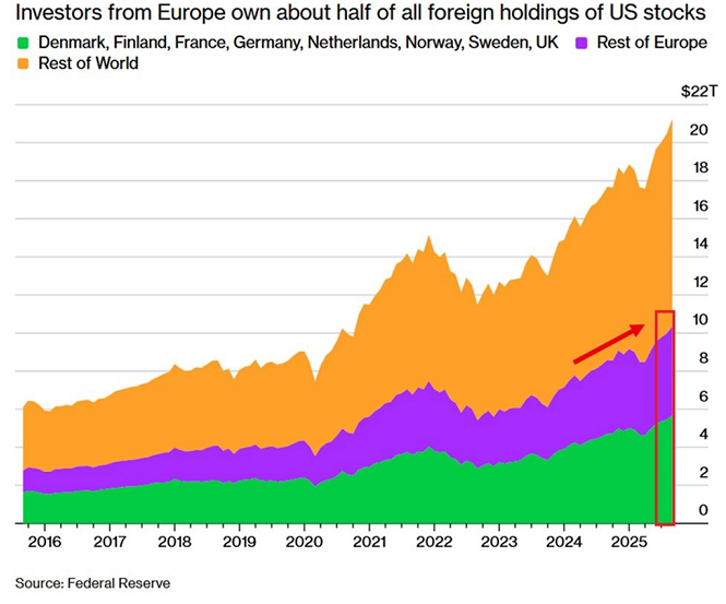 En otras palabras, los inversores europeos representan ahora alrededor del 49 % de todas las participaciones extranjeras en acciones estadounidenses.