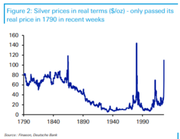 Los precios de la plata en términos reales solo superaron su precio real en 1790 en las últimas semanas, sin haber alcanzado aún máximos históricos cuando se miden de esta manera