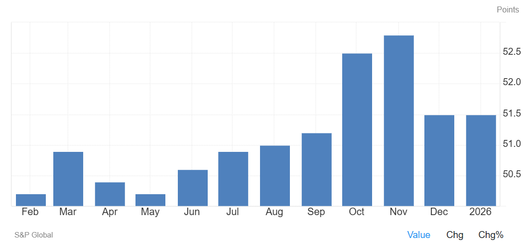 El PMI compuesto de la Eurozona se situó en 51,5 en enero, sin cambios respecto al mes anterior y ligeramente por debajo de las expectativas del mercado, que lo situaban en 51,8