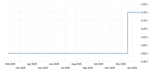 El BoJ mantiene su tipo de interés oficial en el 0,75%, en una decisión ampliamente esperada tras haber subido el tipo del 0,5% en diciembre.