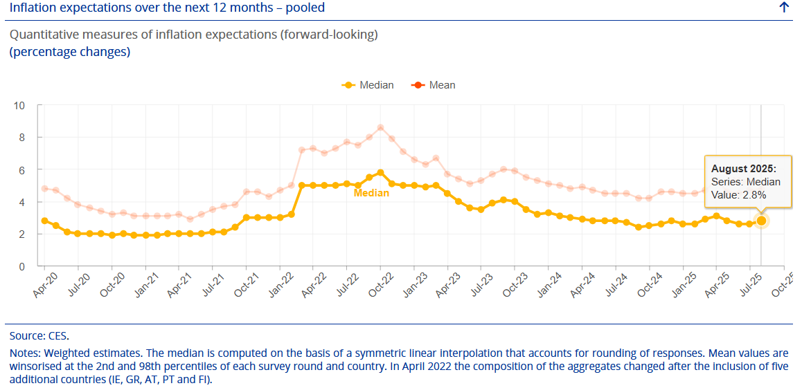La mediana de las expectativas de inflación para los próximos 12 meses subió en agosto hasta el 2,8% desde el 2,6% del mes anterior, mientras que las expectativas a cinco años vista aumentan hasta el 2,2% desde el 2,1%, su nivel más alto desde agosto de 2022.