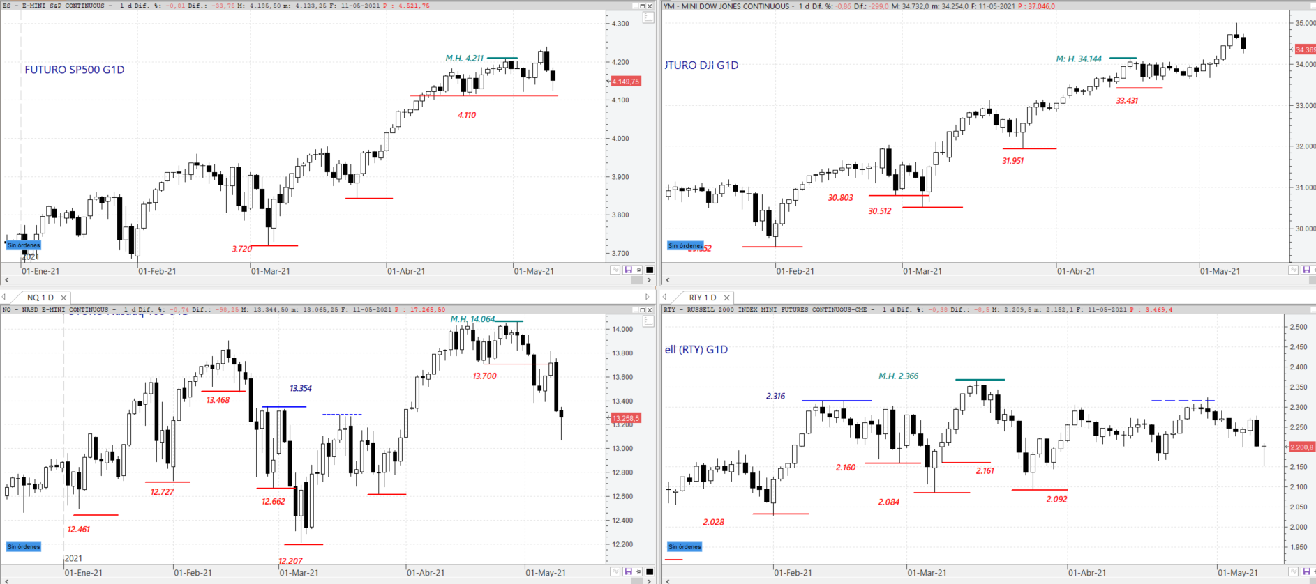 El futuro del S&P 500 en estos momentos está cotizando en 4.149,75 bajando un 0,81%. El futuro del DOW JONES Ind Average cotiza en 34.369 bajando un 0,86%, el del NASDAQ 100 cotiza en 13.258,5 bajando un 0,74% y el del RUSSELL 2000 cotiza en 2.200,8 bajando un 0,30%.