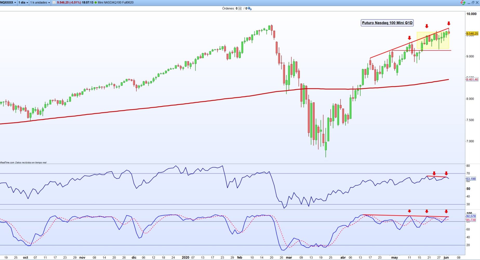 Los futuros europeos Dax, EURO STOXX 50, e incluso el Ibx que se había tenido rezagado, están mostrando fortaleza y limitaciones subidas importantes. Si miramos en gráfico diario el futuro del Dax, vemos que ha llegado a un nivel muy importante, la SMA200 el cual debe superar para continuar su proceso al alza. Por su parte, el futuro del EURO STOXX 50ha alcanzado su SMA100 que de momento está actuando de freno alcista.