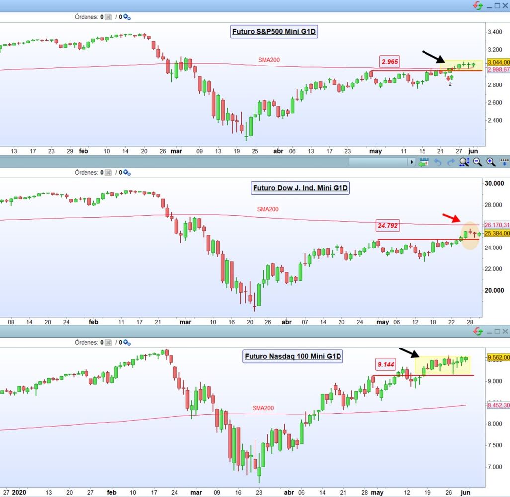 Los índices de los futuros están formando un lateral importante desde que superaron el máximo del 30 de abril. Aunque el aspecto técnico parezca el mismo en gráfico diario (son activos muy correlacionados) las diferencias son importantes, observe la posición de la cotización de los índices respecto a sus respectivas medias de 200 sesiones (SMA200). Lo importante es tener en cuenta al respecto, que en el caso del futuro del Dow Jones Ind. la media está por encima, es decir, actuar como resistencia, en el lugar del acto como soporte como lo hará probablemente en el NASDAQ 100 y S&P 500, puesto que ambos futuros cotizan por encima de la SMA200.