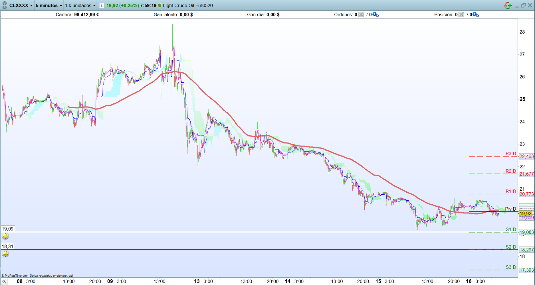 Futuro del Petróleo: ¿Qué zonas son operables hoy en el CP?Mónica Triana García / Carlos Gil Barceló. Analistas de trading de Estrategias de InversiónEl Futuro del petróleo en estos momentos está cotizando en 19,92. Por la estructura tan sumamente bajista del gráfico descartamos las posiciones largas hoy.
