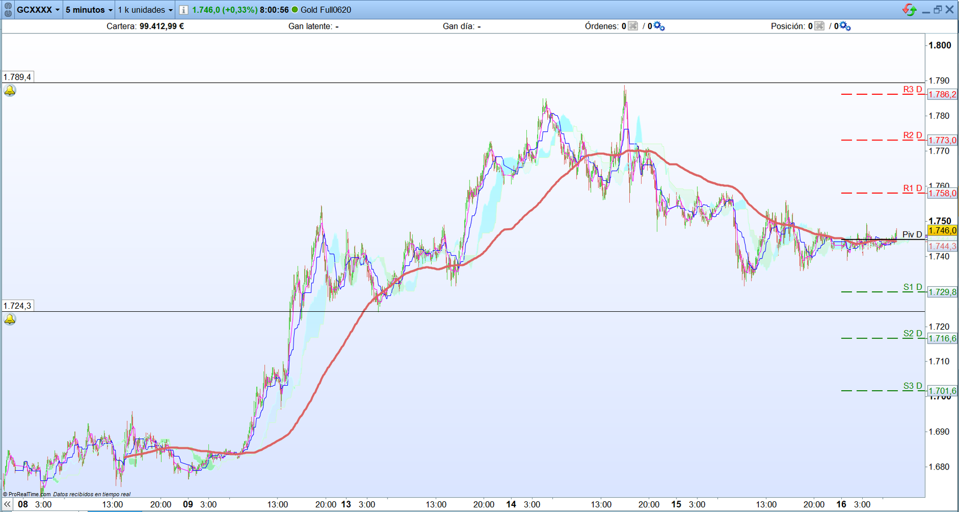 Futuro del Oro: ¿Qué zonas son operables hoy en el CP?Mónica Triana García / Carlos Gil Barceló. Analistas de trading de Estrategias de InversiónEl Futuro del oro está cotizando en 1.746,0. Como ya le ocurrió hace unos días se ha metido en una zona muy amplia, muy complicada de trabajar donde el riesgo de operar es elevadísimo, por lo tanto, hay que esperar a que salga de esta zona. Para esto debería superar 1.789,4 que está bastante lejos o perder 1.724,3 que está algo más cerca.