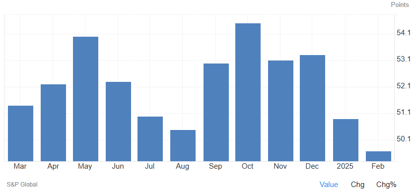 El PMI manufacturero de España cayó a 49,7 en febrero, la primera contracción en más de un año, por debajo del 50,9 de enero y de las expectativas del 51,4