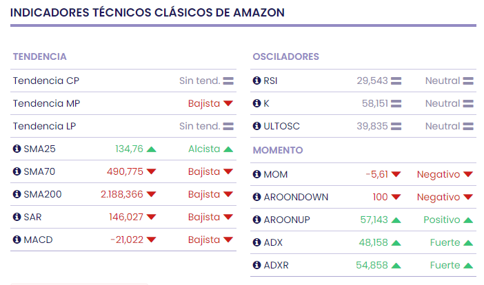 Amazon cotiza en los 136 dólares y la media móvil de 200 periodos se encuentra por encima de las últimas velas. Mientras, los indicadores de Ei se muestran mixtos.