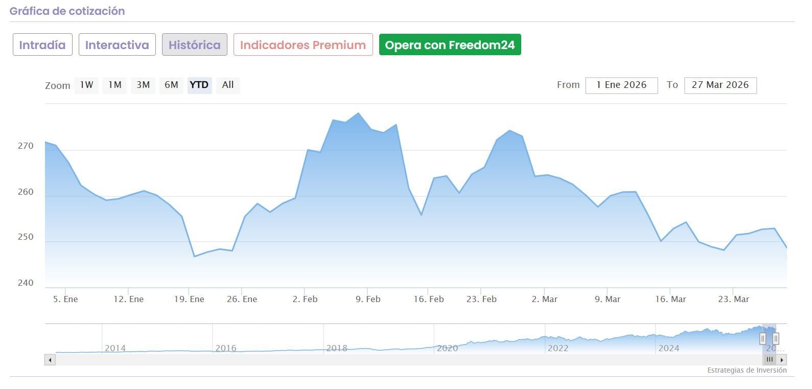 Ahora mismo si hiciéramos una foto fija de Apple en el mercado veríamos que desde sus máximos, con la situación de conflictividad bélica vivida en el mercado, la compañía de la manzana cede un 13,80% desde los máximos interanuales registrados el pasado 3 de diciembre en los 288,62 dólares por título.