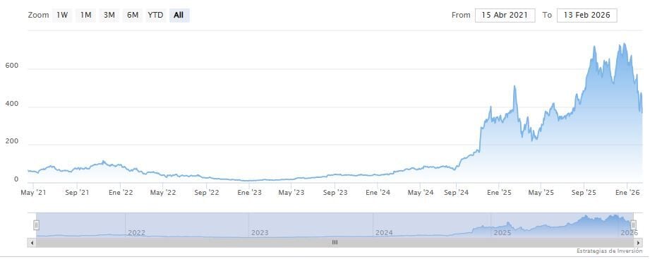AppLovin Rg-A cerraba la semana pasada al alza en los 390.95 dólares, recordad que ayer Wall Street estuvo cerrado por el festivo del “Día de los Presidentes”. La media móvil de 200 periodos se encuentra encima de las últimas ocho velas, RSI al alza en los 35 puntos y las líneas del MACD debajo del nivel de cero.