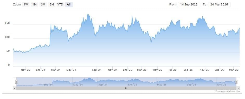 Arm Hldg Sp ADR despega con un gap alcista hasta los 157.15 dólares. La media móvil de 200 periodos se encuentra en la apertura del mencionado gap, RSI al alza en los 78 puntos y las líneas del MACD encima del nivel de cero.