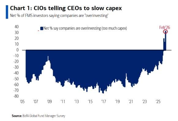 Una encuesta de Bank of America Global (BofA) ha revelado que las empresas están gastando demasiado. Reflejándose esto en el Capex alcanzando un máximo histórico en medio de la carrera por la inteligencia artificial o IA, según Rose Henderson en Yahoo Finance.