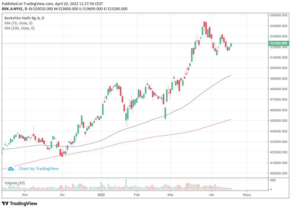 Berkshire Hathaway cerraba la sesión del martes en los 523.260 dólares y la ubicación de las medias móviles, la de 70 periodos por encima de la de 200 periodos, nos daría una señal alcista. Mientras, los indicadores de Ei se muestran en su mayoría alcistas.